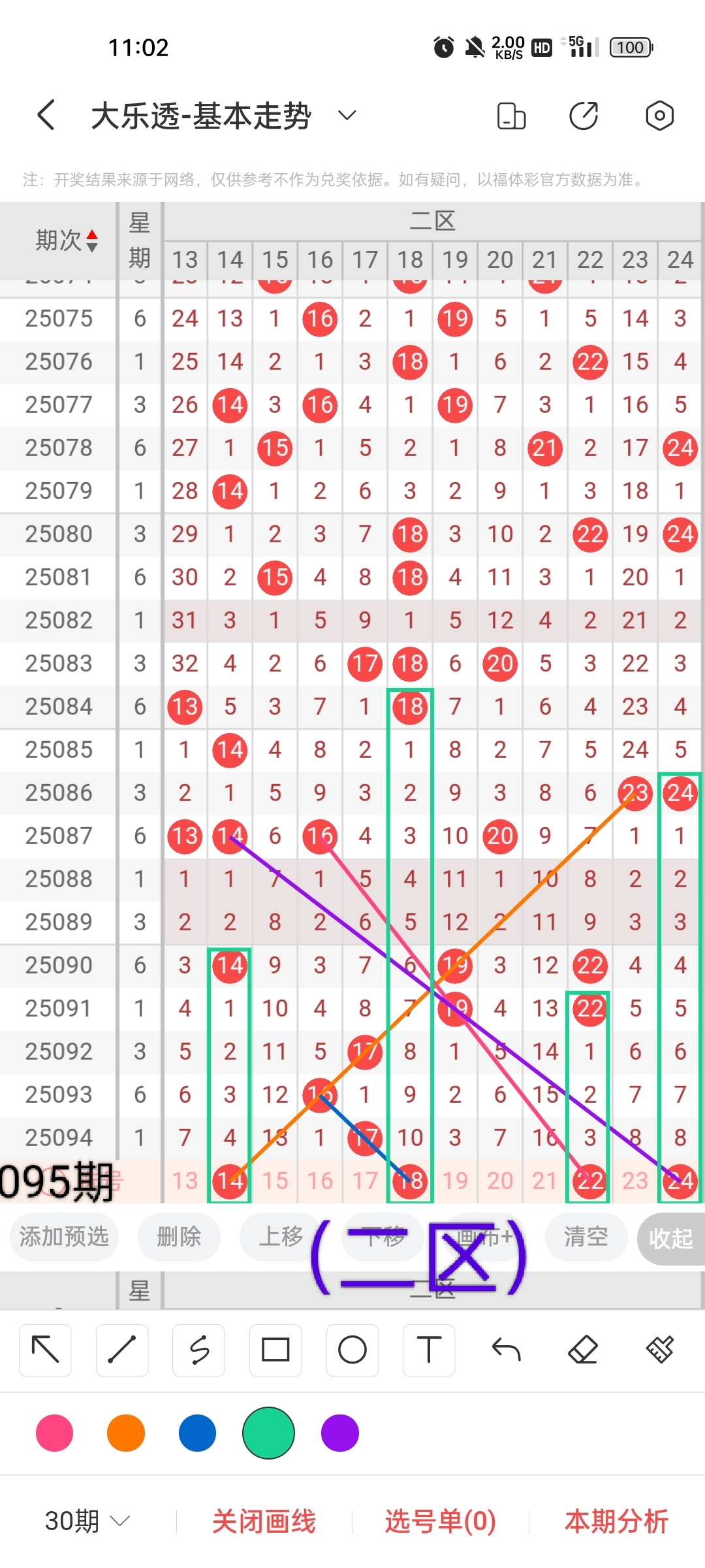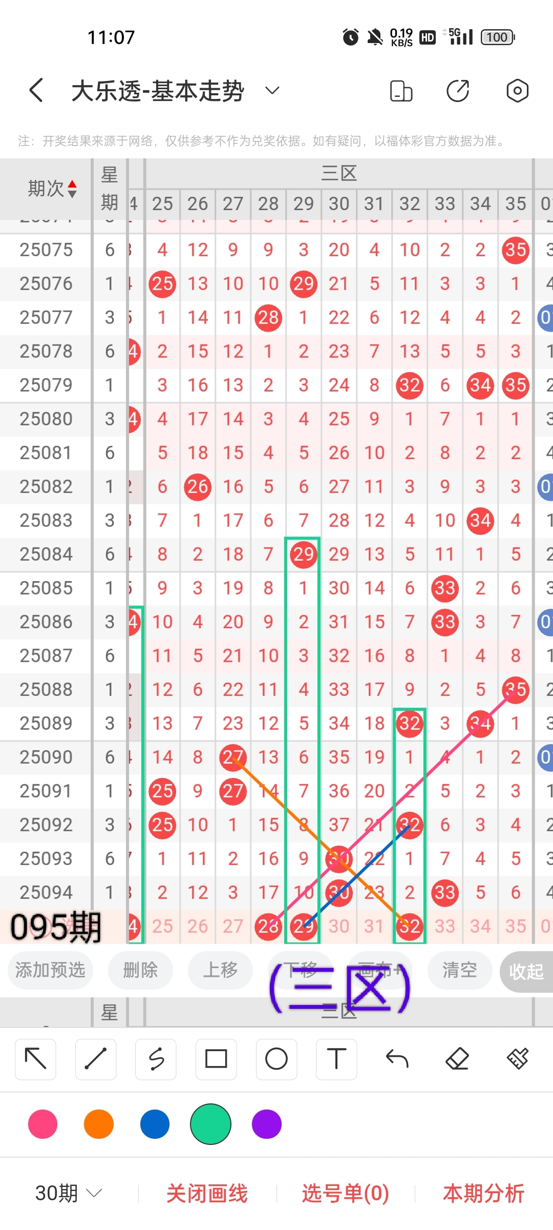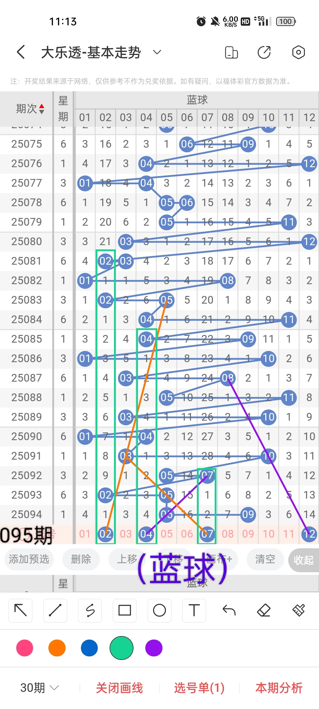 小梁根据图中画线思路,最后给大家汇总提供一下大乐透本期红球、蓝球数据,供大家参考:
