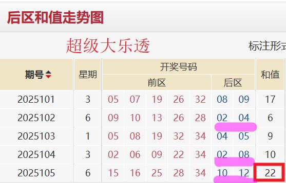 近五期大乐透开奖号码后区和值依次为17→6→9→10→22。后区和值均值为13。后区和值振幅为16,后区和值修正振幅为13。基于动态平衡干预以及波动趋势衡量,本期后区和值推测区间为3-23。基于风险对冲策略,本期后区和值区间缩水为6-18。