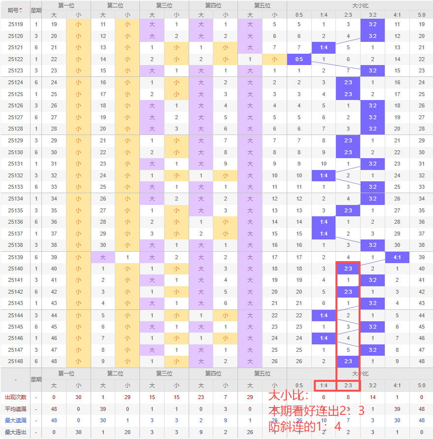 上期大小比:2:3,近10期大小比出现情况:4:1、2:3、3:2、2:3、3:2、1:4、3:2、1:4、3:2、2:3,最近10期出现4期3:2,出现3期2:3,出现1期4:1,出现2期1:4,出现0期5:0,出现0期0:5,根据近10期规律本期看好连出2:3,防遗漏2期开出1:4,综上所述推荐大小比推荐:1:4,重点关注:2:3。