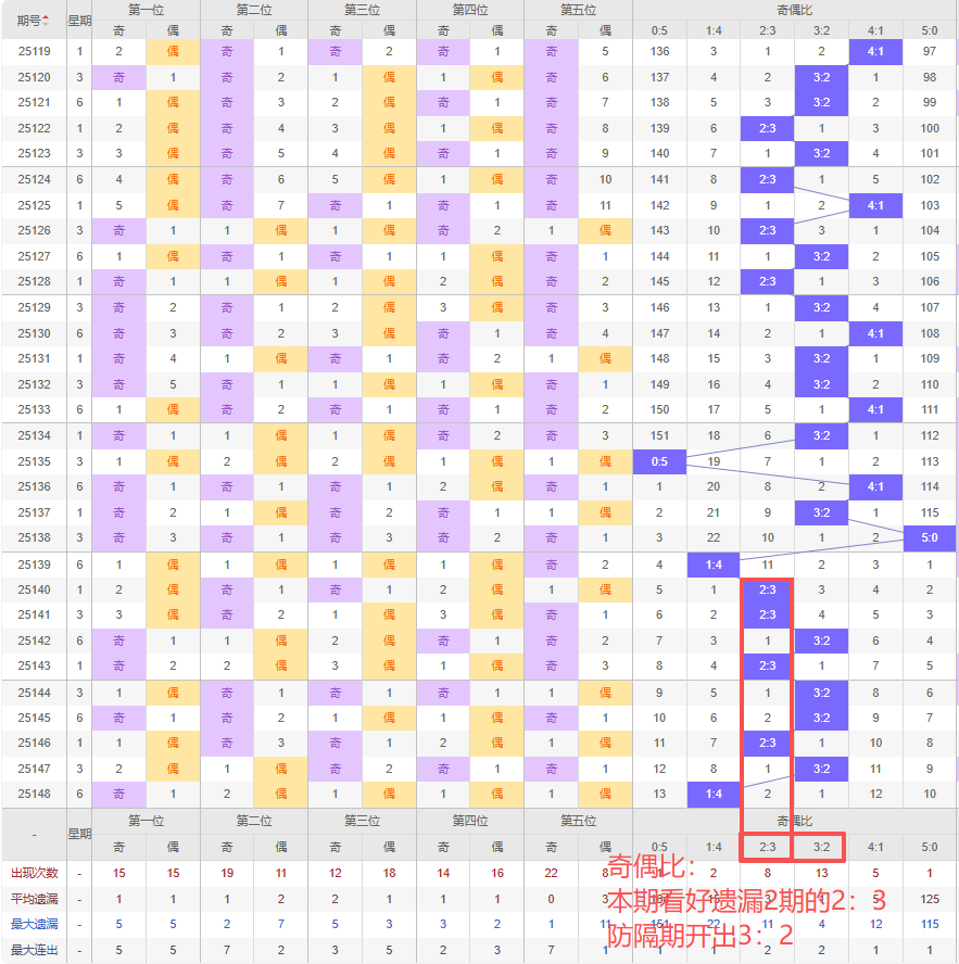 上期奇偶比:1:4,近10期奇偶比出现情况:1:4、2:3、2:3、3:2、2:3、3:2、3:2、2:3、3:2、1:4,最近10期出现4期3:2,出现4期2:3,出现0期4:1,出现2期1:4,出现0期5:0,出现0期0:5,根据近10期规律本期看好遗漏2期出2:3,防隔期出3:2,综上所述推荐奇偶比推荐:3:2,重点关注:2:3。