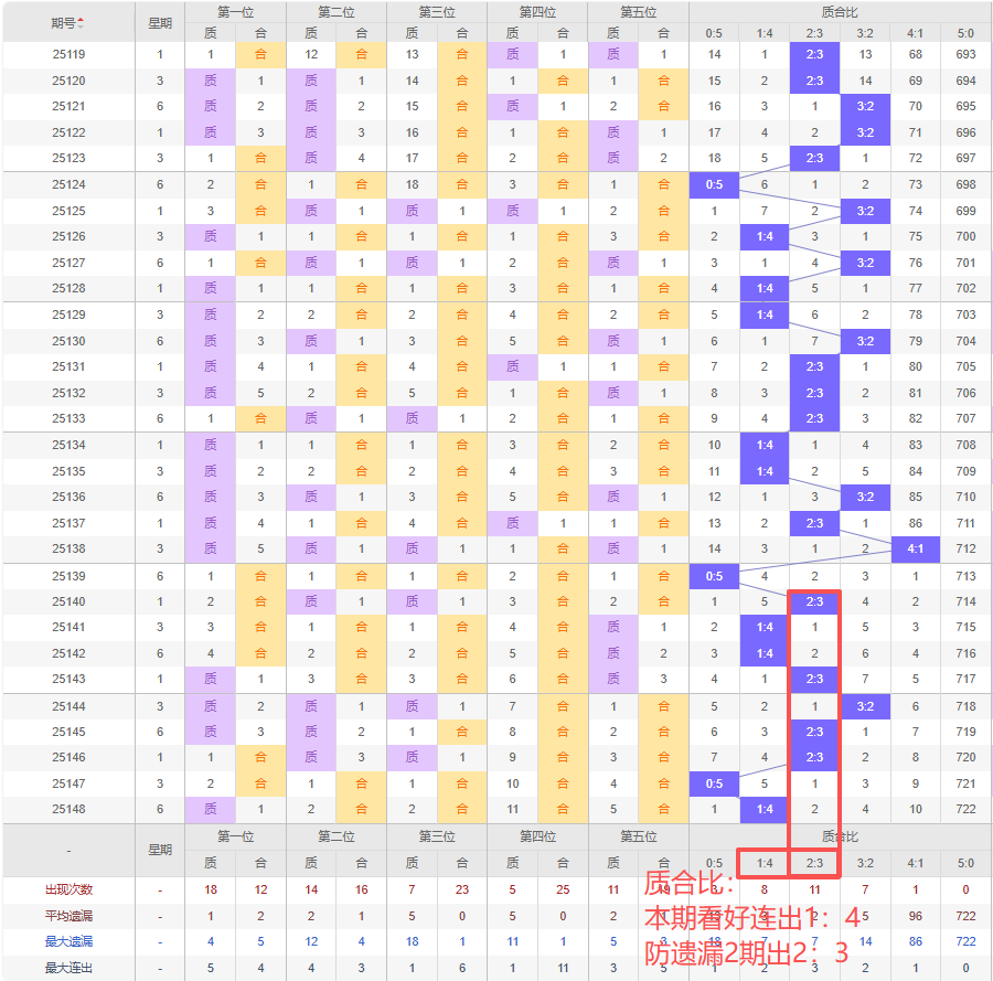 上期质合比:1:4,近10期质合比出现情况:0:5、2:3、1:4、1:4、2:3、3:2、2:3、2:3、0:5、1:4,最近10期出现1期3:2,出现4期2:3,出现0期4:1,出现3期1:4,出现0期5:0,出现2期0:5,根据近10期规律本期看好连出1:4,防遗漏2期出2:3,综上所述推荐质合比推荐:2:3,重点关注:1:4。