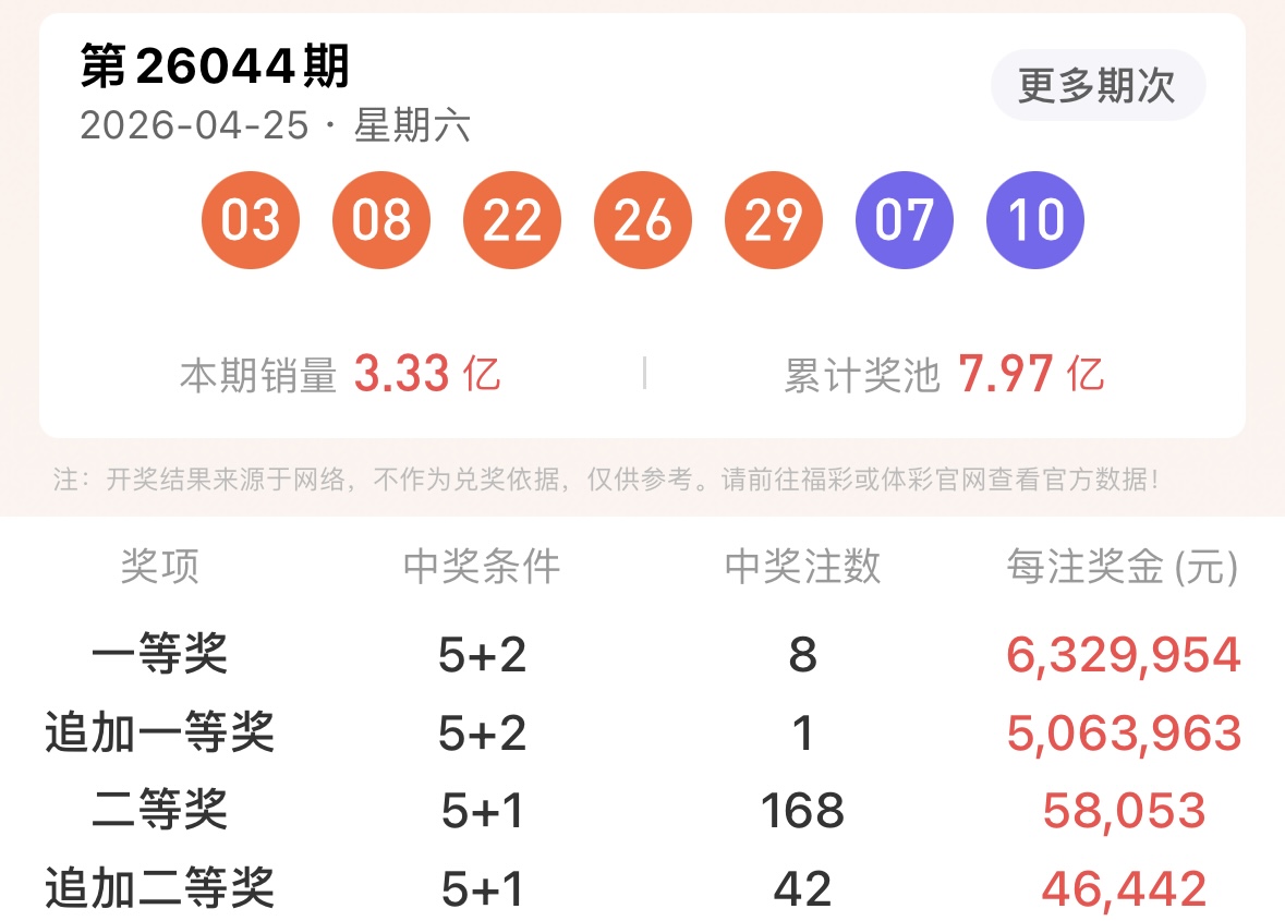 大乐透上期开出中奖号码03、08、22、26、29+07、10 ,全国共开出一等奖八注,单注奖金6,329,954元钱,其中有一注为追加投诉,多得奖金5,063,963元钱,一等奖分别花落黑龙江基本1注追加1注、安徽基本1注、山东基本1注、湖北基本1注、广东基本1注、重庆基本1注、贵州基本1注、陕西基本1注。二等奖共开出168注,每注奖金58,053元钱,其中有42注为追加投注,每注多得奖金46,442元钱。