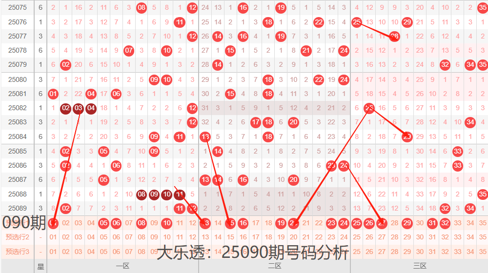 通过上期号码的简单分析,我们看下25090期红色号码球的总体走势,如下图: