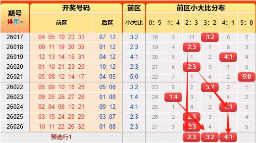 上期前区小大比2:3。言归正传我们继续用历史数据说话,前区小大比分成6051423324150(如图),我统计了一下历史出现次数,05出现107次、14出现518次、23出现983次、32出现823次、41出现357次,50出现56次,再看近10期小大比出现次数比为014221,通过历史数据对比观察以及根据遗漏对称理论原则,故本期我们选择2:3、3:2、4:1(具体精准方向请查看小车小大比精选)