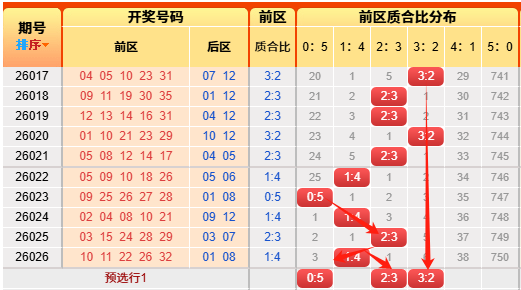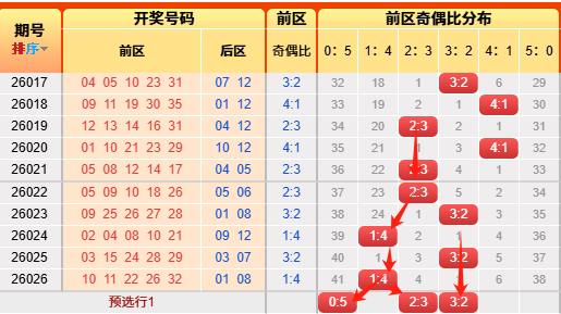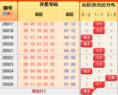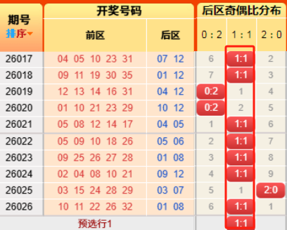 上期后区开出奇偶比为1:1,连续推测命中
