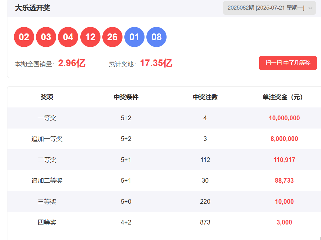 今天是2025年7月23号星期三,是大乐透第083期开奖,那么我们首先回顾一下上一期082期的开奖结果,开奖0203041226,后区开奖0108。全国中出一等奖4注,追加3注,追加总奖金1800万,二等奖112注,追加30注,追加后奖金是19万