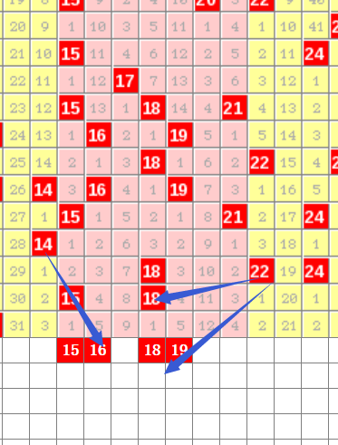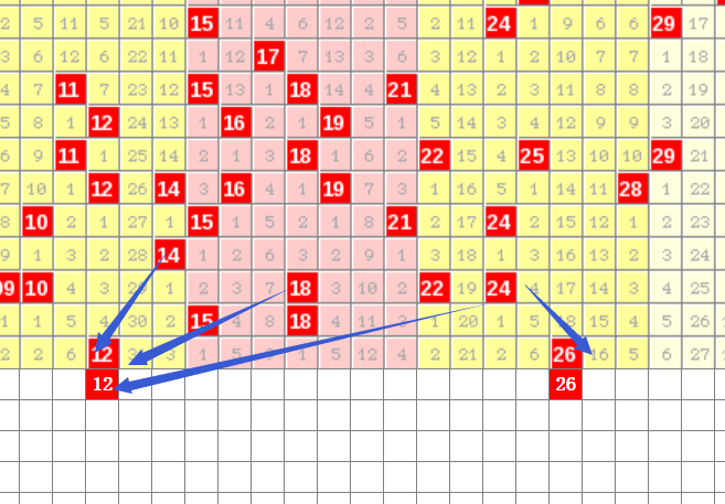 那么我们对照着走势图,首先分析一下上一期这个突破口,我们该怎么去突破开的这个小号。跨度是24,跨开了四个双数,一个奇数,那么首先上一期的这个突破口,我个人的话是从这个04作为一个突破口,还有一个这个12号12.15.18斜连号,这个26的话,算是一个冷号了。间隔18期12和26啊,大家通过走势图上可以看到,形成了一个特殊的等腰梯形