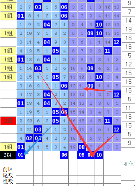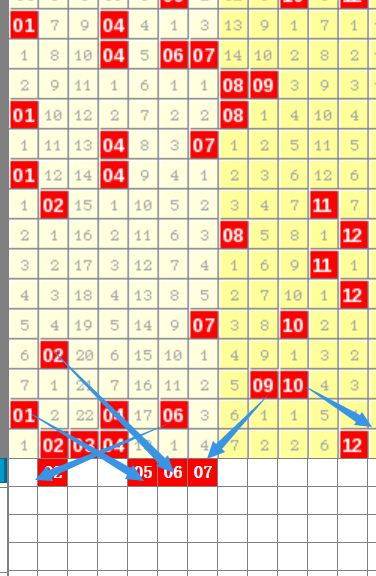现在我们正式开始分析0837,我们先从一分区啊,我们把01~12当做一分区,上一期开了这个四个号码,本期的话这个地方不会落空。如果是说大家看好有重号的话啊,那就关注02和12啊,这两个重号,顺便大家关一下关注一下567啊,这个6的话也是一个斜连号啊,5跟6都是斜连号码