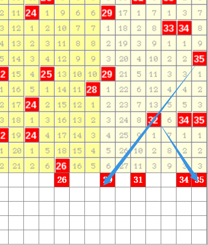 三分区从24~35,这作为三分区这个区间应该来说分析难度应该是最大了,那么这个26的话,它如果往右的话,我们主要关注一个2829这样一个近跨的一个号码,如果是说2829。如果还有组合的话,就关注293134 31.34.35这几个组合