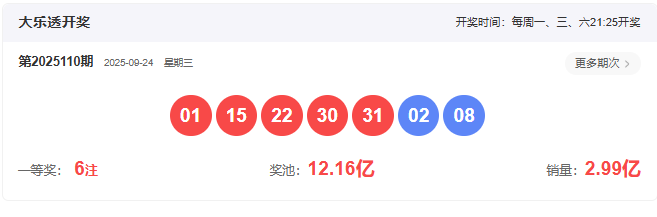 开奖号码:01 15 22 30 31- 02 08