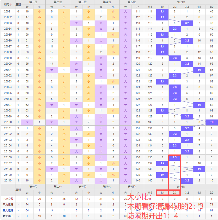 上期大小比:3:2,近10期大小比出现情况:3:2、2:3、3:2、2:3、3:2、2:3、1:4、4:1、1:4、3:2,最近10期出现4期3:2,出现3期2:3,出现1期4:1,出现2期1:4,出现0期5:0,出现0期0:5,根据近10期规律本期看好遗漏4期的2:3,防隔期开出1:4,综上所述推荐大小比推荐:1:4,重点关注:2:3。