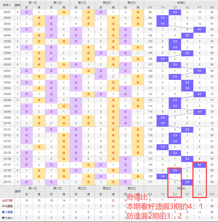 上期奇偶比:3:2,近10期奇偶比出现情况:3:2、2:3、2:3、1:4、2:3、3:2、4:1、2:3、1:4、3:2,最近10期出现3期3:2,出现4期2:3,出现1期4:1,出现2期1:4,出现0期5:0,出现0期0:5,根据近10期规律本期看好遗漏3期的4:1,防遗漏2期的2:3,综上所述推荐奇偶比推荐:2:3,重点关注:4:1。