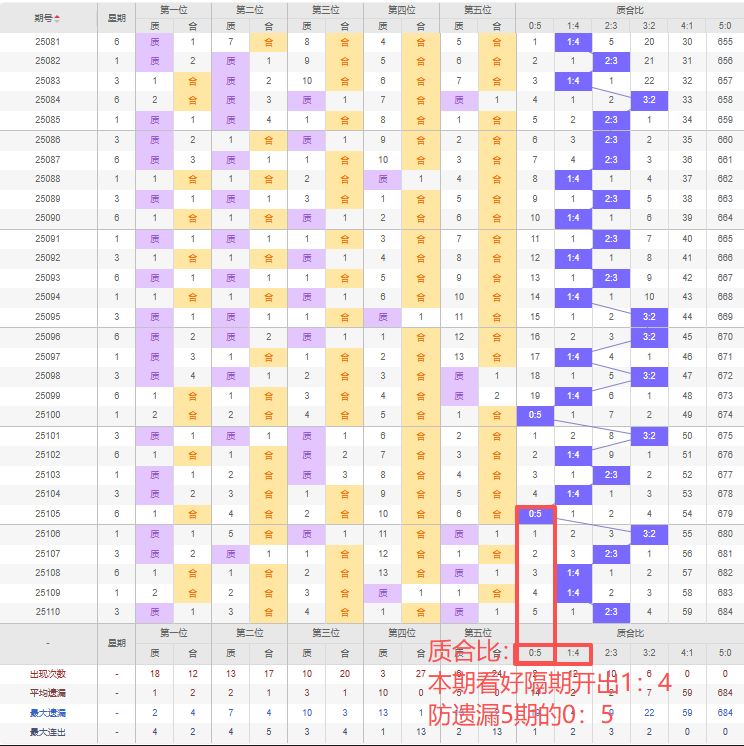 上期质合比:2:3,近10期质合比出现情况:3:2、1:4、2:3、1:4、0:5、3:2、2:3、1:4、1:4、2:3,最近10期出现2期3:2,出现3期2:3,出现0期4:1,出现4期1:4,出现0期5:0,出现1期0:5,根据近10期规律本期看好隔期开出1:4,防遗漏5期开出0:5,综上所述推荐质合比推荐:0:5,重点关注:1:4。