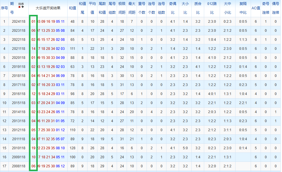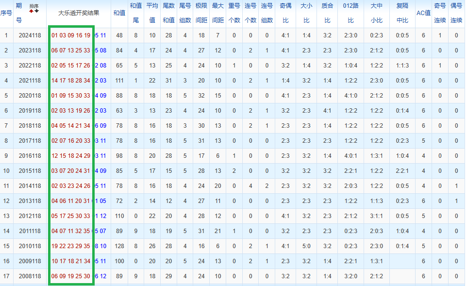 通过观察,我发现往年同期的开奖数据与本期号码之间存在显著关联。具体来说,在前区号码中,从第一位至第五位,通常会有约三个位置上的数字与往年同期相同位置的号码一致;而后区号码中,也有多期开奖结果直接包含了往年同期的数字。因此,我们可以借助往年同期各位置上的号码,作为分析本期开奖情况的重要依据。在此基础上,还可结合往年同期的其他相关条件,进行综合性的号码组合推荐。