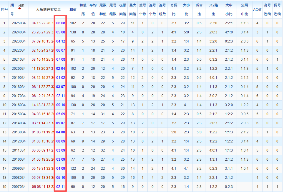 通过观察,我发现往年同期的开奖数据与本期号码之间存在显著关联。具体来说,在前区号码中,从第一位至第五位,通常会有约三个位置上的数字与往年同期相同位置的号码一致;而后区号码中,也有多期开奖结果直接包含了往年同期的数字。因此,我们可以借助往年同期各位置上的号码,作为分析本期开奖情况的重要依据。在此基础上,还可结合往年同期的其他相关条件,进行综合性的号码组合推荐。