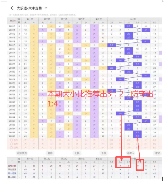 5、大小比:上期开出大小比为3:2,近122期开出4:2出现25次,3:2出现55次,2:3出现52次,1:4出现31次,5:0出现4次,本期推荐出3:2。