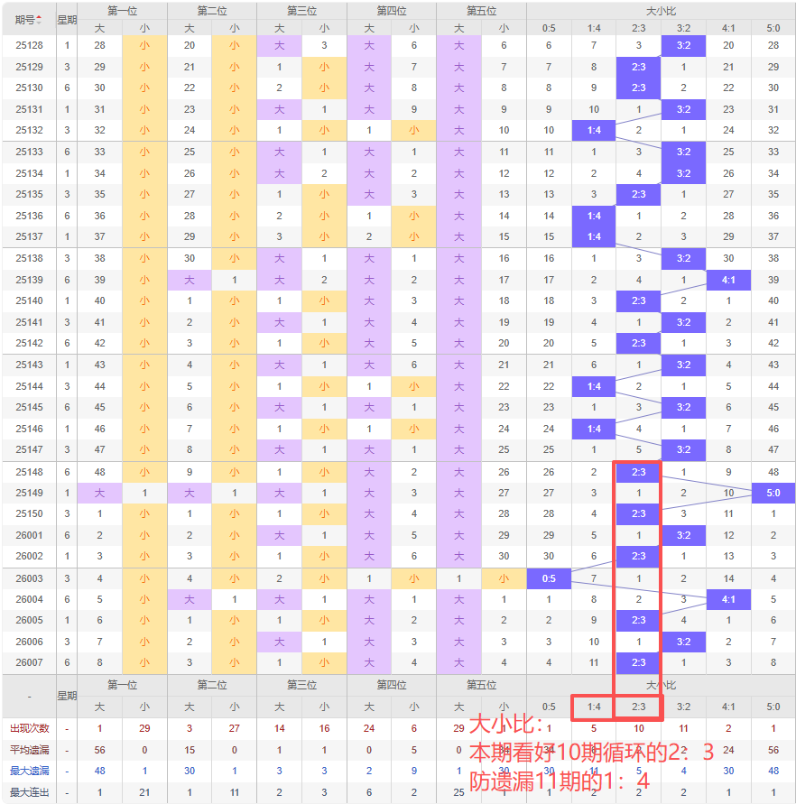 上期大小比:2:3,近10期大小比出现情况:2:3、5:0、2:3、3:2、2:3、0:5、4:1、2:3、3:2、2:3,最近10期出现2期3:2,出现5期2:3,出现1期4:1,出现0期1:4,出现1期5:0,出现1期0:5,根据近10期规律本期看好10期循环的2:3,防遗漏11期出1:4,综上所述推荐大小比推荐:1:4,重点关注:2:3。