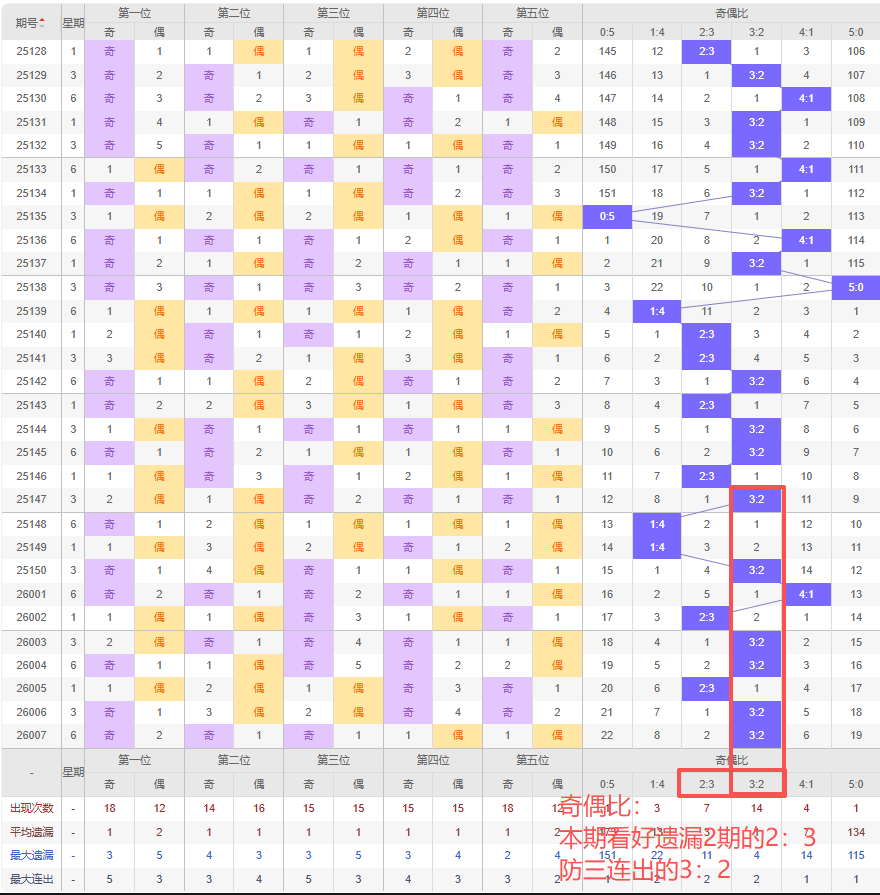 上期奇偶比:3:2,近10期奇偶比出现情况:1:4、1:4、3:2、4:1、2:3、3:2、3:2、2:3、3:2、3:2,最近10期出现5期3:2,出现2期2:3,出现1期4:1,出现2期1:4,出现0期5:0,出现0期0:5,根据近10期规律本期看好遗漏2期出2:3,防三连出的3:2,综上所述推荐奇偶比推荐:3:2,重点关注:2:3。