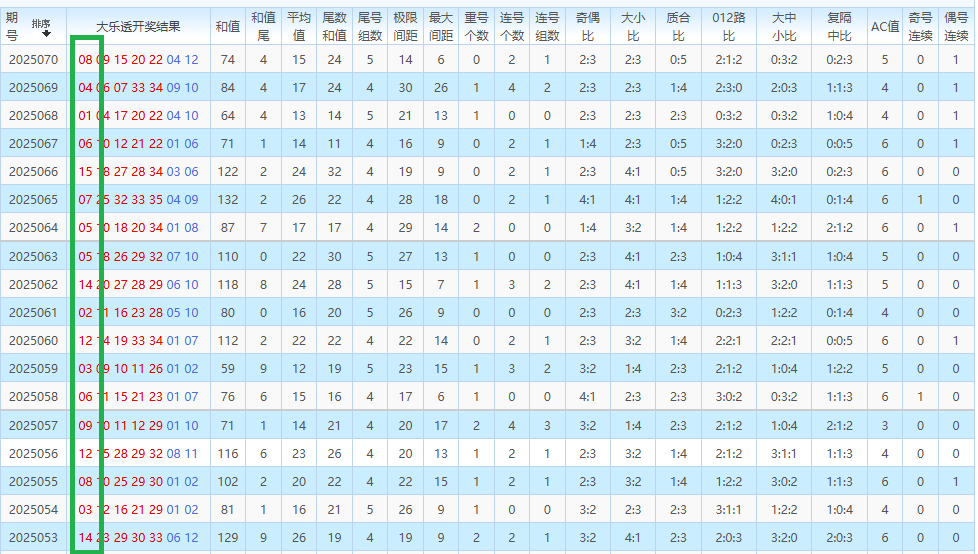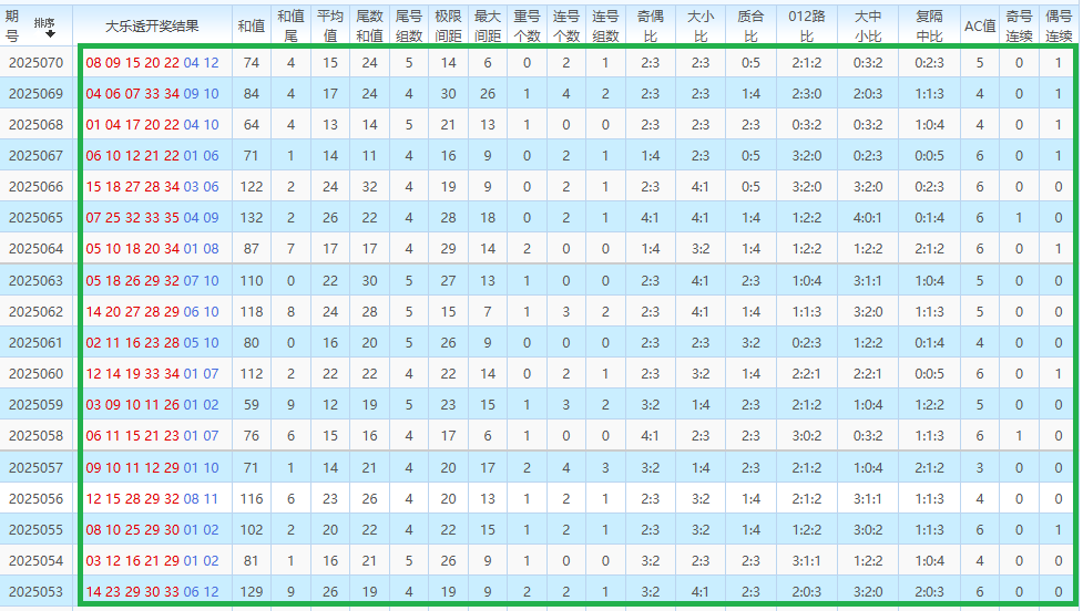 首先回顾大乐透25070期开奖结果:08 09 15 20 22+04 12.