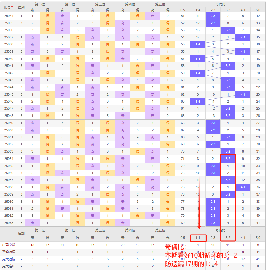 上期奇偶比:2:3,近10期奇偶比出现情况:3:2、2:3、2:3、3:2、4:1、3:2、2:3、2:3、2:3、2:3,最近10期出现3期3:2,出现6期2:3,出现1期4:1,出现0期1:4,出现0期5:0,出现0期0:5,根据近10期规律本期看好10期循环的3:2,防遗漏17期的1:4,综上所述推荐奇偶比推荐:1:4,重点关注:3:2。