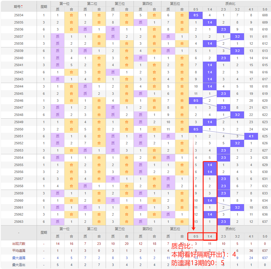 上期质合比:2:3,近10期质合比出现情况:2:3、1:4、1:4、2:3、2:3、2:3、1:4、3:2、1:4、2:3,最近10期出现1期3:2,出现5期2:3,出现0期4:1,出现4期1:4,出现0期5:0,出现0期0:5,根据近10期规律本期看好隔期开出1:4,防遗漏13期的0:5,综上所述推荐质合比推荐:0:5,重点关注:1:4。