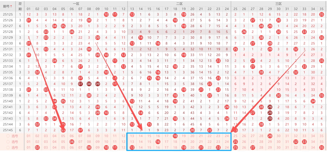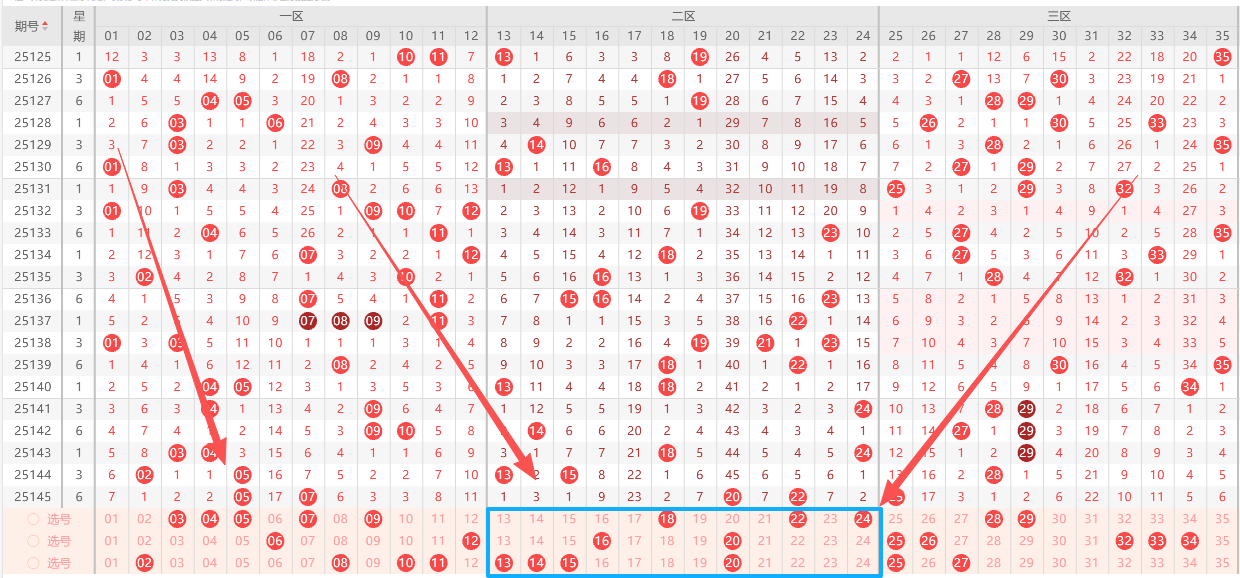 第三区:本期的凤尾,可以考虑32和33,35几个号码,3区号需要考虑25, 27和29这几个号码。
