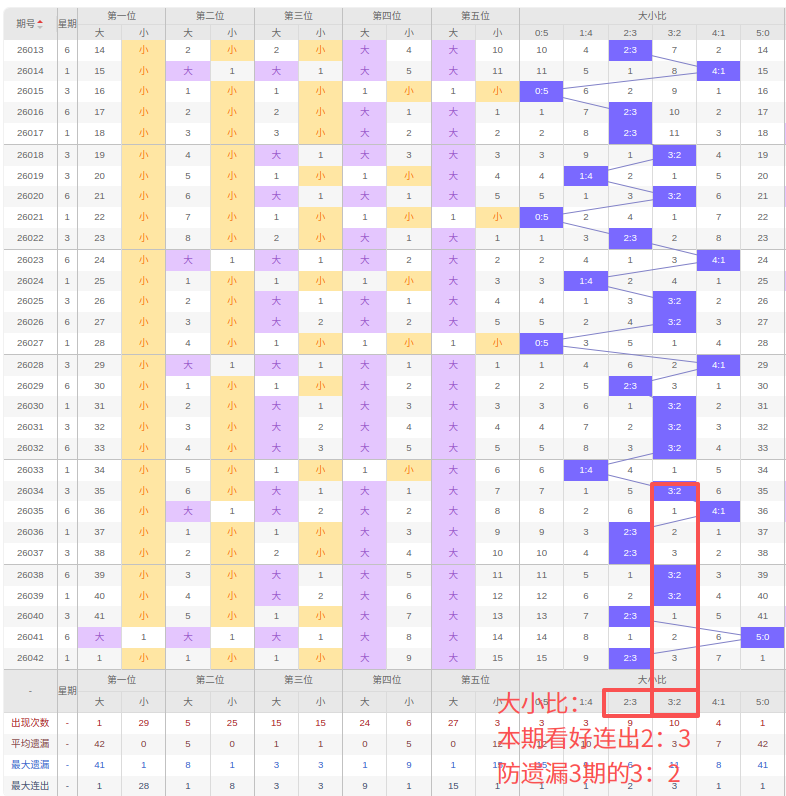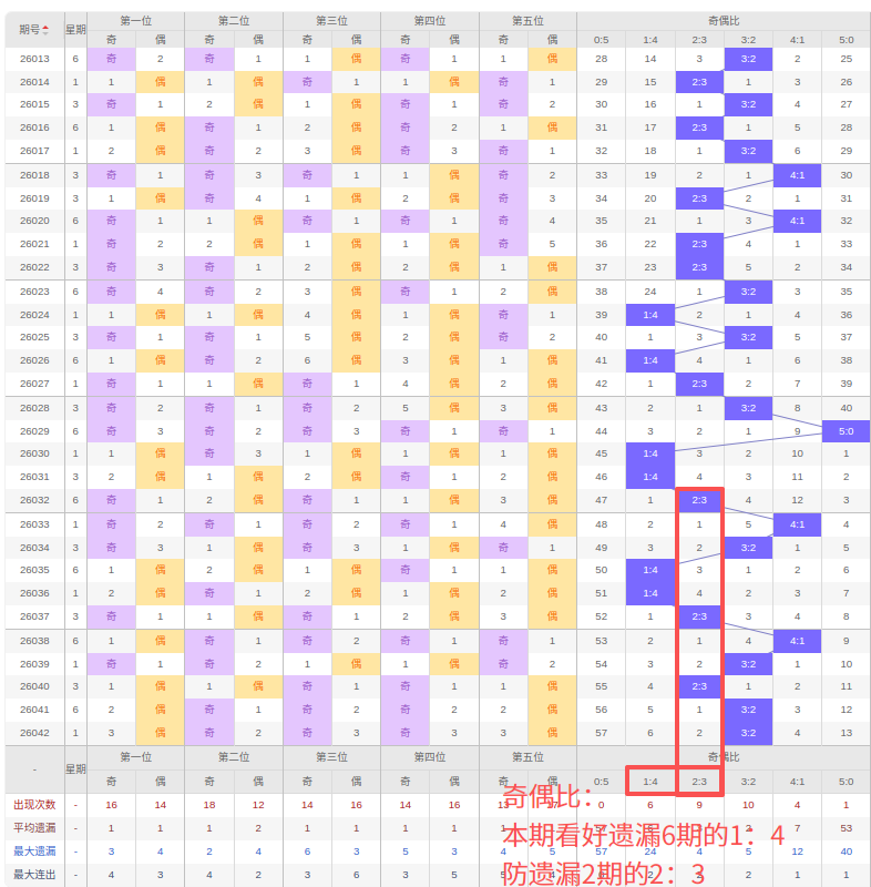 上期奇偶比:3:2,近10期奇偶比出现情况:4:1、3:2、1:4、1:4、2:3、4:1、3:2、2:3、3:2、3:2,最近10期出现4期3:2,出现2期2:3,出现2期4:1,出现2期1:4,出现0期5:0,出现0期0:5,根据近10期规律本期看好遗漏6期出的1:4,防遗漏2期出2:3,综上所述推荐奇偶比推荐:2:3,重点关注:1:4。