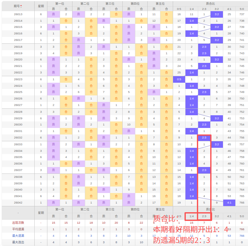 上期质合比:4:1,近10期质合比出现情况:3:2、1:4、1:4、1:4、2:3、1:4、1:4、1:4、1:4、4:1,最近10期出现1期3:2,出现1期2:3,出现1期4:1,出现7期1:4,出现0期5:0,出现0期0:5,根据近10期规律本期看好隔期出1:4,防遗漏5期的2:3,综上所述推荐质合比推荐:2:3,重点关注:1:4。