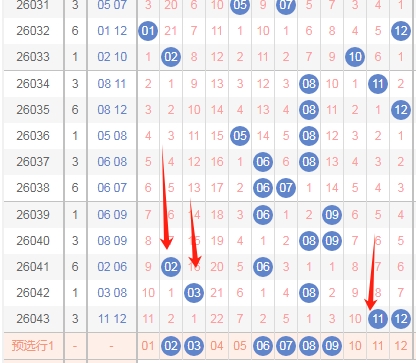 上图是体彩大乐透后区开奖号码走势分布图,我标注出来的红色箭头表示右边这个数字最近连续三期开出的都是偶数数字,很明显右边这个数字最近十几期开出的偶数多,那么本期右边这个数字可以关注出奇数数字,那么右边这个数字的范围就是03 05 07 09 11。