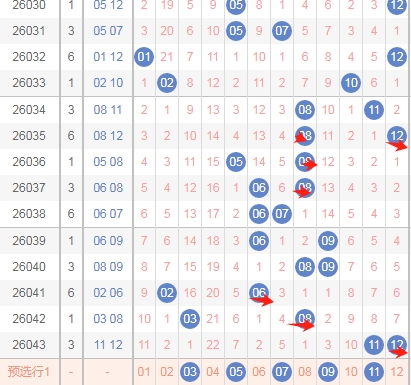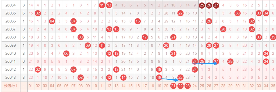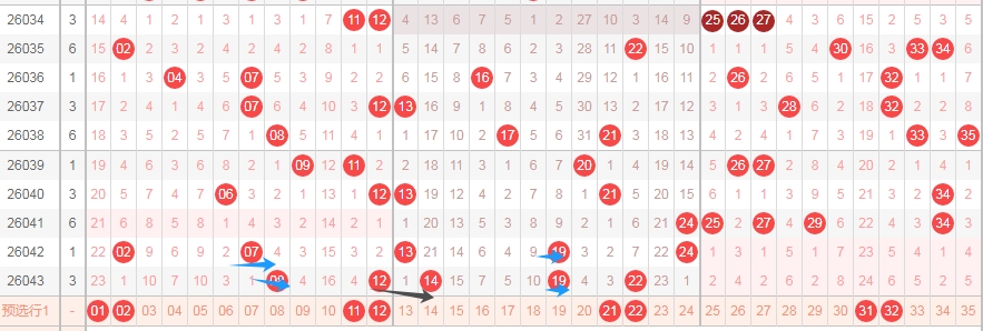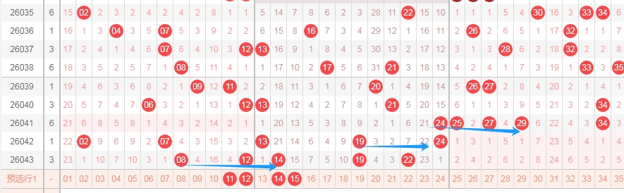 上图是体彩大乐透前区开奖号码走势分布图,我标注出来的蓝色箭头看看有点相似的地方,假设和上面一样的走法的话,那么本期可以考虑一下连号组合1112或者连号组合1415。