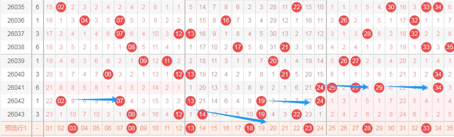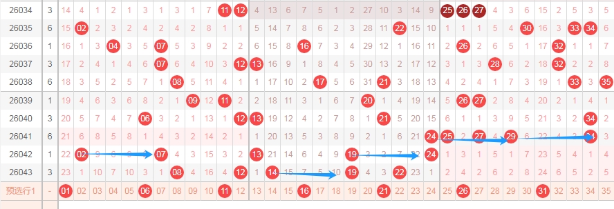 上图是体彩大乐透前区开奖号码走势分布图,我标注出来的蓝色箭头看看都是跨度五组合,上期出现了跨度五组合1419,那么根据这些跨度五组合来分析的话,跨度五组合还有0106 0611 1116 1621 2126 2631这些都是跨度五组合,可以关注这些组合出现一组,或者关注数字01 06 11 16 21 26 31出两个数字。