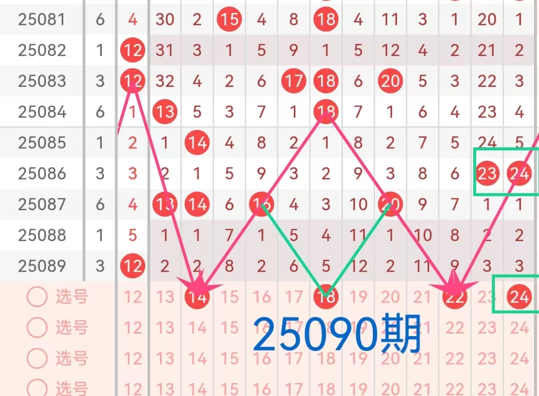 2. 二区(13-24):上期该区间没有任何号码开出,出现断区现象。考虑近期该区间较冷,本期考虑会有1-2个号码回补开出。因此,本期可以关注该区间内近期遗漏次数较大的号码,如14、22这些号码在走势上表现出一定的稳定性,且与前几期出号形成呼应,有望出现在本期开奖中。号码18在画线走势上,有较好的出号走向,本期有望出现。
