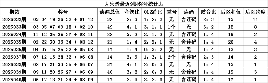 后区跨度:后区近9期跨度分别开出11-8-3-4-3-2-1-3-1,跨度奇偶比为6:3,上期跨度下降2个点位,本期防跨度重复出现1。