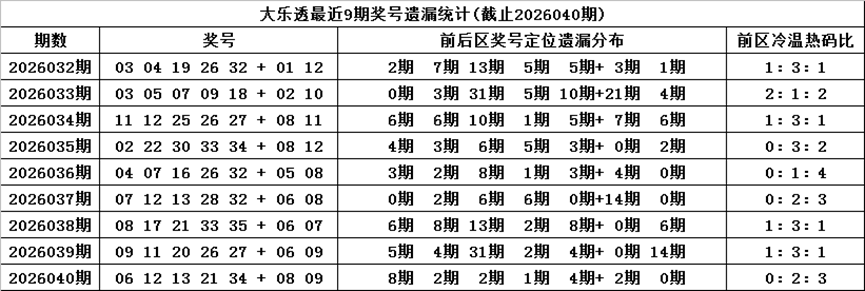 体彩大乐透第2026040期奖号为:06 12 13 21 34 + 08 09,各位号码遗漏期数分别为:8期、2期、2期、1期、4期+2期、0期,前区号码遗漏总期数为17期,012路比为3:2:0,奇偶比为2:3,没有开出重复号码。后区号码遗漏总期数为2期,和值为17,跨度为1。