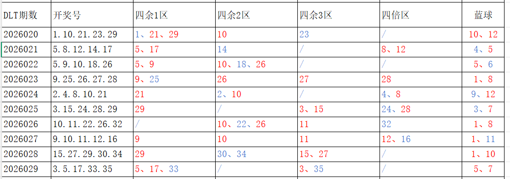 分享第一个数据分析:四分区统计数据。相对于传统的三分区,个人习惯使用四分区,就是把35个红球号码除以4,所得的余数分区如下: