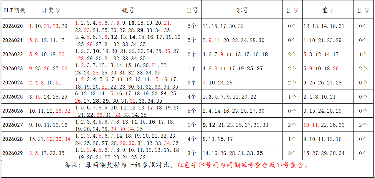 如图,以近两期数据为一组,进行对比分析,相同的孤号、邻号可能在下期开出。本期参考孤号:1.7.8.9.10.11.12.13.14.15.19.20.21.22.23.24.25.26.27.28.29.30.31;邻号:2.4.6.16.18.32.34。重点关注:孤邻号重合号码:***(会员专区可见)。个人分析,仅供参考。