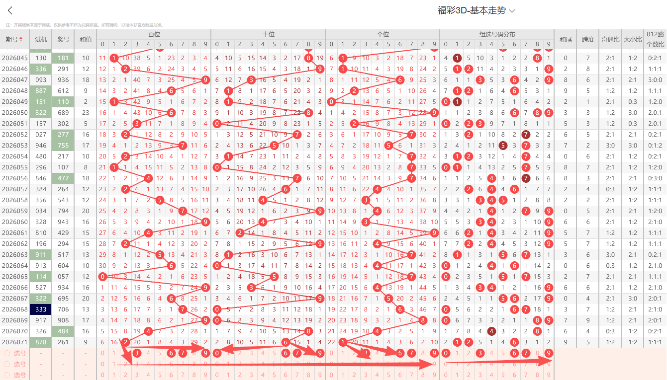 ③个位:上期开出小号奇数1号,上期出现奇偶互变开出奇数1路号码,根据历史记录012路及奇偶周期性规律变化的特征特点本期0路号码有开出的趋势1路号码注意预防。