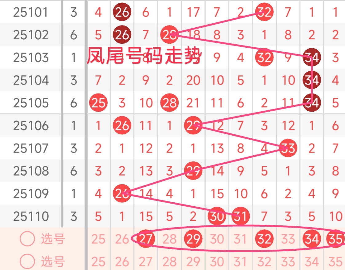 红球三区推荐(25~35):上期红三区开出2枚号码,号码为30、31,本期红三区建议出号1-3枚,本期红三区推荐关注号27、29、32、34、35。