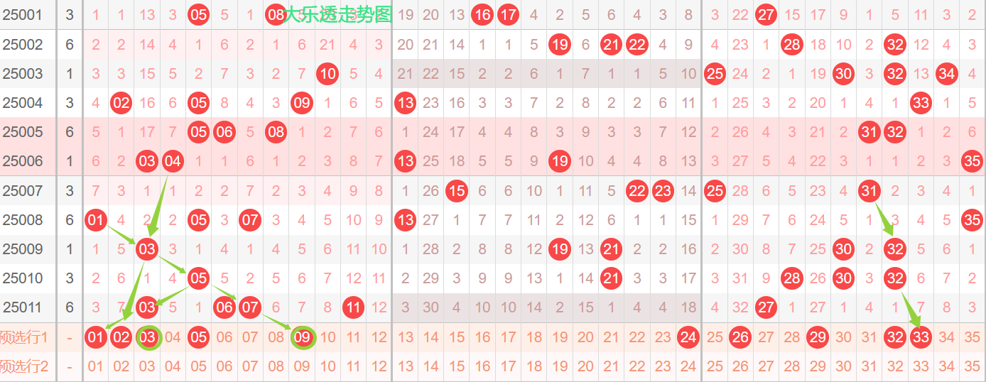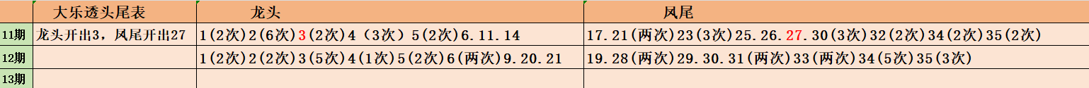 龙头凤尾:先简单回顾下之前的龙头趋势,在第8期之前的趋势是上期出几路下期继续出,从第8期开始改变趋势,上期出几路下期不出,那么已经延续四期了,本期恐将生变,也就是有概率龙头继续出与上期龙头相同的0路,单数双数明显是单数强势,连续七期单数龙头了,去年最高纪录是连续十三期单数龙头,所以要做到对多错少最好的办法就是顺势而为,所以龙头如果你也看0路,就在重号3或者斜连号9这里选,如果不看0路,那么就在1.5之中选,这个1是非常漂亮,漂亮到不敢选,与之前也很对称,我个人不是很看好,所以主看3.5.9里出龙头,假如改变趋势出偶数龙头则看看2,龙头部分就分析这么多,凤尾主看0路与二路,首先要注意本期会不会头尾单双一致,那么如果龙头出单数,凤尾单数也是有概率的,比如31.32之后,会不会32.33,这个33有出号需求,剩下的冷号占三个,应该是不同出的,冷号倾向一个,总之我个人比较看好龙头凤尾是同路号,即龙头用二路凤尾也用二路,凤尾用0路,龙头你也用0路,年前我做了一个头尾表,那是因为我发现最近十几期的龙头凤尾都在里面,也是经过测试可以做到对多错少才拿出来,所以如果判断对几路号,选对单数双数,就可以在头尾表里找号了,也就是技术是在不断提升的,只需要运气好一点也许就能实现心中的梦。