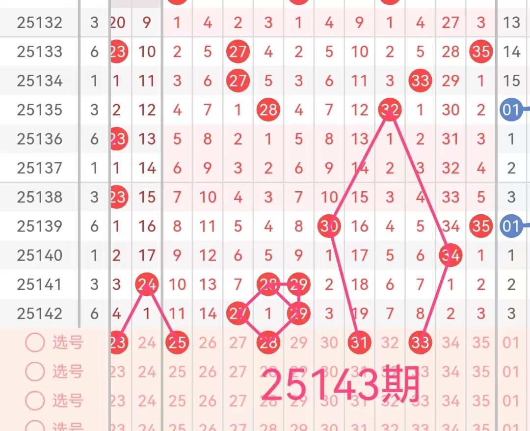 2. 凤尾号码分析:凤尾号码(前区最大号码)上期是29。这是一个偏大的凤尾,过去十期内,凤尾号码多集中在18到35之间,其中3字头号码表现较为活跃。因此,本期应重点关注18-35区间的数字,特别是号码25、28、31、33