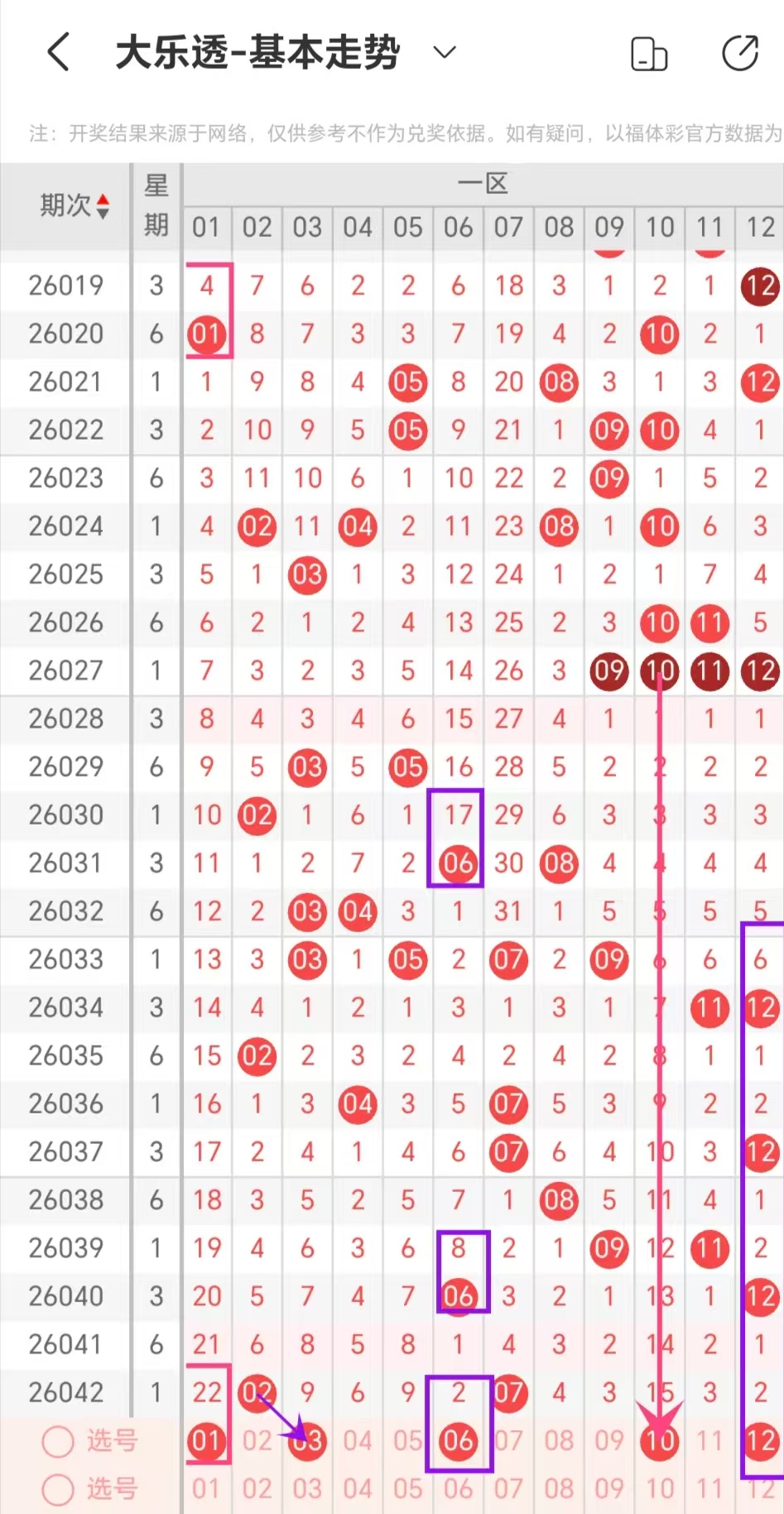 通过对同星期周三重号出现数量规律进行统计分析,本期考虑出号1-2个,即06-12-13-21-34出号1-2个