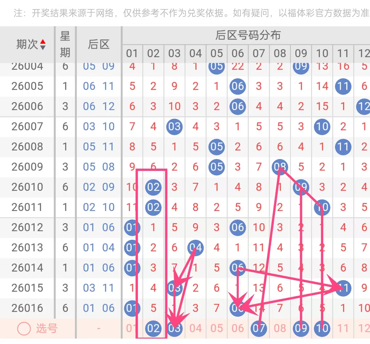 后区重复明显:后区01出现4次、06出现3次,形成短期强势组合,需警惕回调。