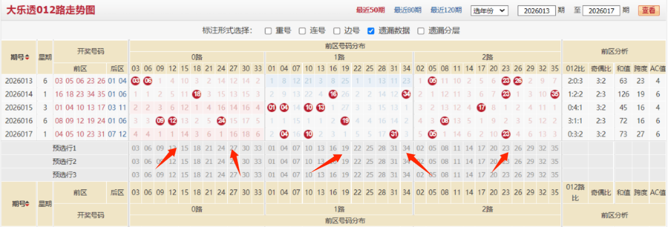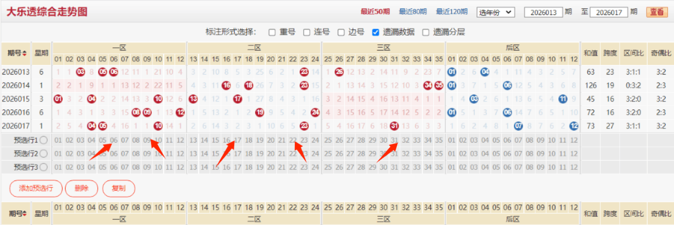 上期大乐透的开奖号码为:04 05 10 23 31+07 12,和值为73,跨度为27,区间比例为3:1:1,奇数偶数比例为3:2,012路比例为0:3:2。机号码所展示出来的特征趋势主要就体现在一区的连号这里。二区三区主要就是做路数的穿插和回补。本期号码重点关注中右侧热度的回补,这是本期号码的初始基本思路。