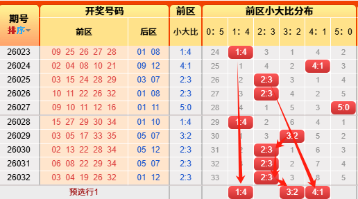 上期前区小大比2:3。言归正传我们继续用历史数据说话,前区小大比分成6种0:5、1:4、2:3、3:2、4:1、5:0(如图),我统计了一下历史出现次数,0:5出现107次、1:4出现519次、2:3出现986次、3:2出现823次、4:1出现358次,5:0出现57次,再看近10期小大比出现次数比为0:2:5:1:1:1,通过历史数据对比观察以及根据遗漏对称理论原则,故本期我们选择1:4、3:2、4:1;(具体精准方向请查看小车小大比精选)