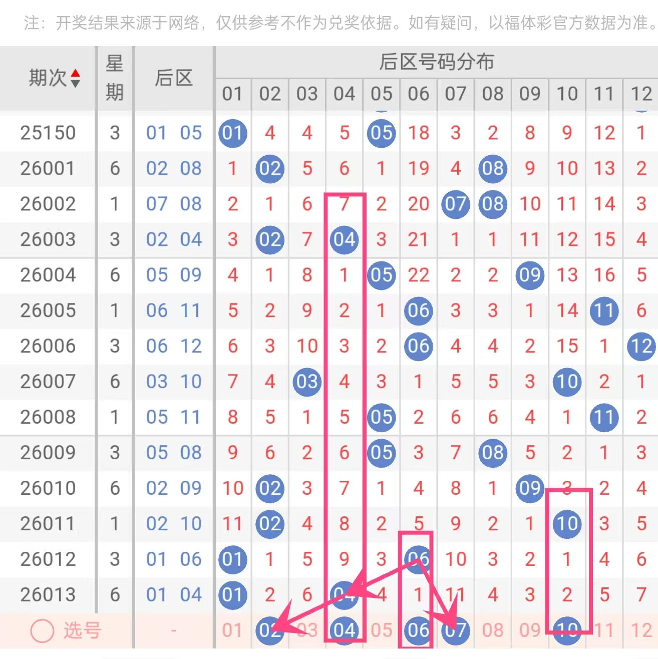 温冷搭配:06在近5期出现2次,属于温号;07、10在近期后区中仅出现1次,但历史间隔显示已进入回补周期。