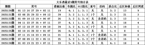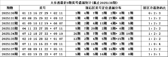 体彩大乐透第2025138期奖号为:01 03 19 21 23 + 07 11,各位号码遗漏期数分别为:5期、6期、5期、16期、1期+2期、0期,前区号码遗漏总期数为33期,012路比为2:2:1,奇偶比为5:0,没有开出重复号码。后区号码遗漏总期数为2期,和值为18,跨度为4。