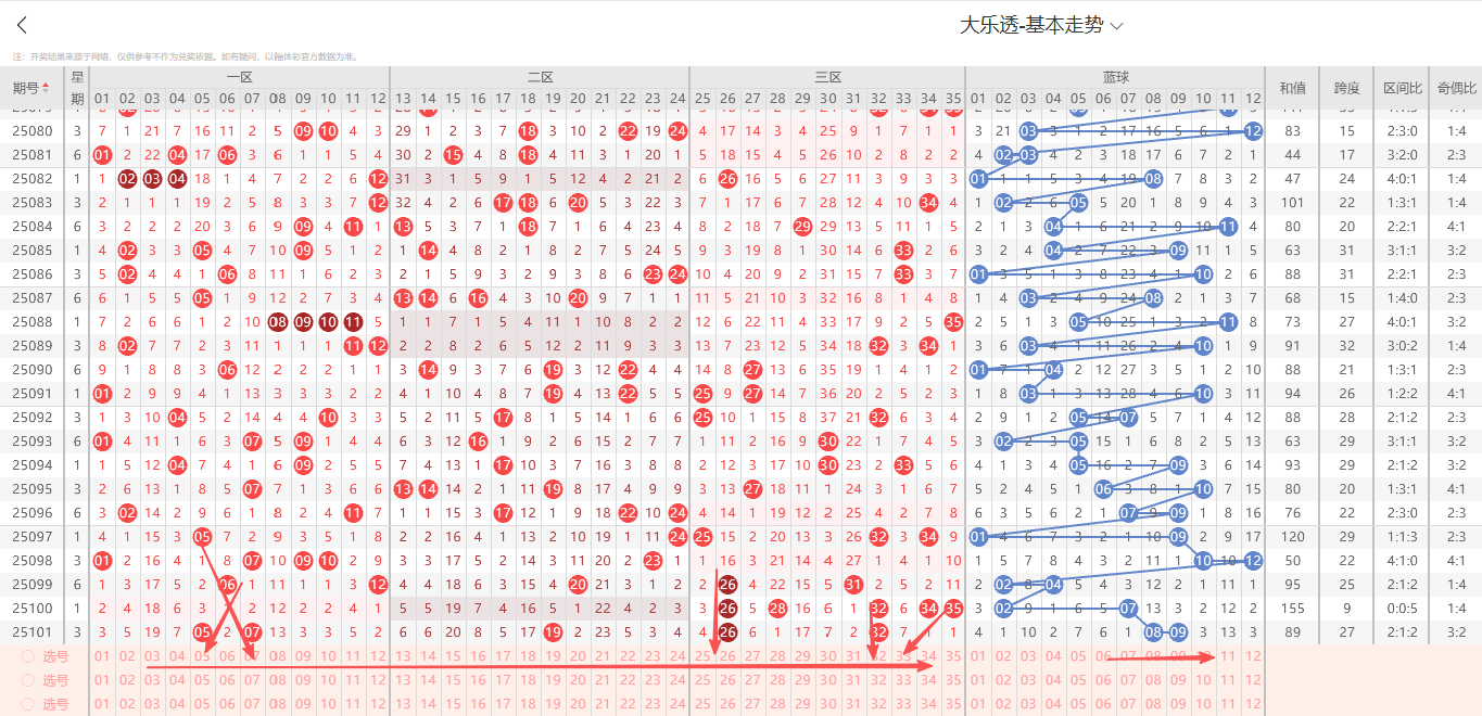 1、前区特征分析:(通过整体走势不难看出每期开奖号都具备以下明显的特征点)