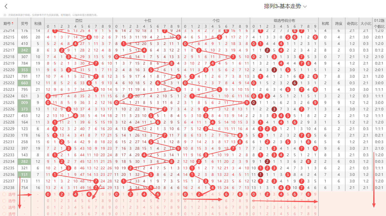 ①百位:上期开出大号奇数7号,在历史开奖记录中显示一般正常的奇偶周期平均在1~3期为普遍现象,奇数连续开出4期上期为1路号码,依据奇偶以及012路周期性规律的转变特征点即本期1路号码有开出的趋势0路号码注意预防。