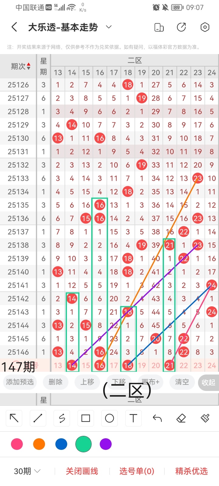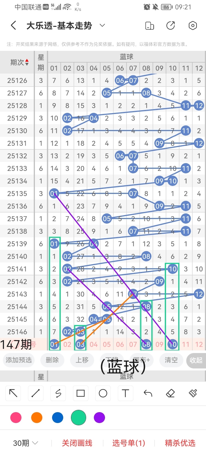 小梁根据图中画线的思路,最后给大家汇总一下大乐透本期红球、蓝球数据,供大家参考: