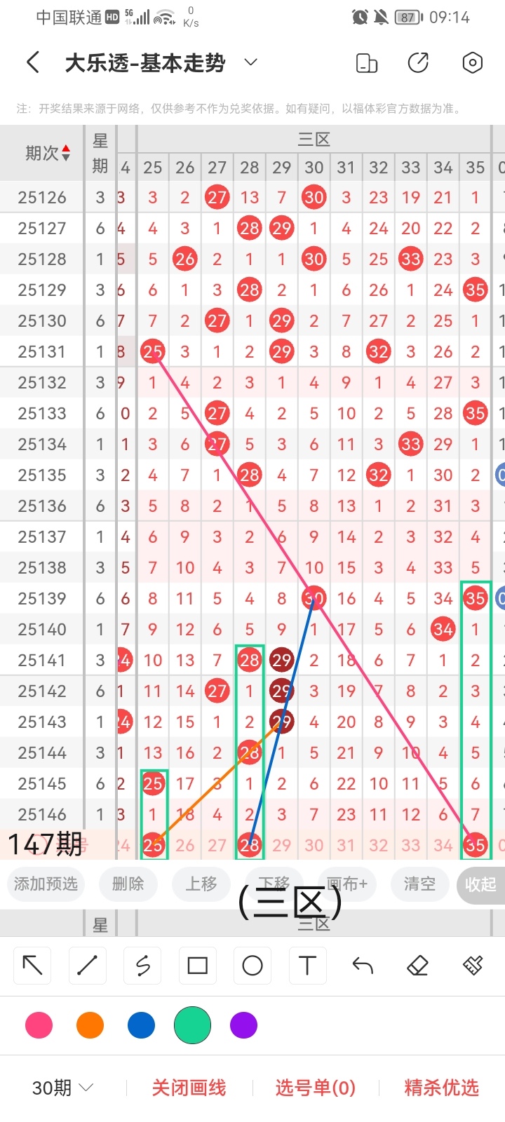 小梁结合最近五期第三区开出号码比例2:1:1:1:0,取最近五期的平均值,本期第三区间将开出的号码个数约为1个。首先,小梁根据图中画线的思路及走势分析,号码25与前几期开出的号码呈斜三连的走势且呈隔期回补的走位。其次,号码28与前几期开出的号码呈斜三连的走势且呈连续隔两期回补的走位。然后,号码35与前几期开出的号码呈隔七期回补的走位且呈斜三连的走势。综上所述,小梁结合图中的画线思路分析,本期第三区可能开出的号码是25、28、35。